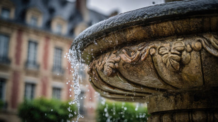 A close-up of the intricate details of a stone fountain as water splashes down, with ripples forming in the basin.