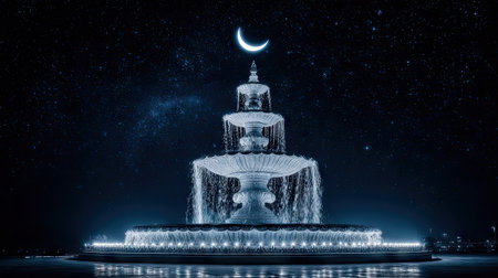 A tiered fountain is the central element of the composition, with water cascading in multiple levels. The scene presents a dark aesthetic, featuring a crescent moon above. The lighting creates a glowing effect on the water and the fountain structure. Suitable for artistic projects, design, and editorial uses, it evokes a sense of serenity.
