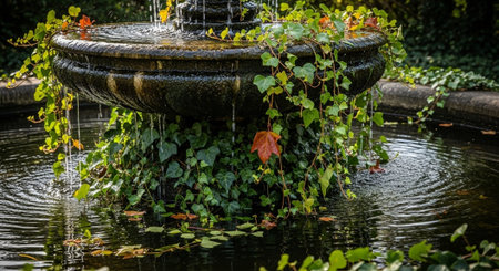 A classic tiered fountain serves as the centerpiece of a serene garden oasis.