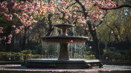 A tranquil fountain surrounded by lush cherry blossom trees creates a picturesque scene in a vibrant park. The gentle cascade of water enhances the serene atmosphere.