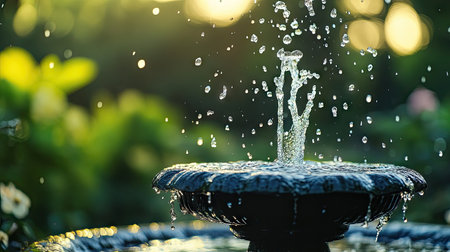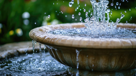 Water droplets flying in the air as they splash from a small garden fountain, with lush greenery in the background.