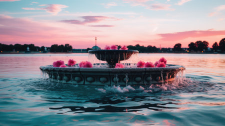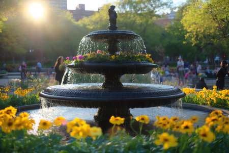 Ornamental fountain cascading water in a vibrant city park, adorned with colorful flowers, as the sun sets, creating a tranquil urban oasis