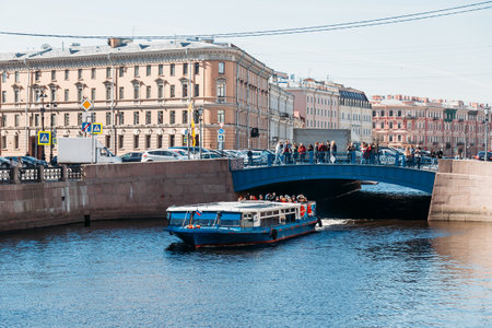 Saint Petersburg, Russia - June 15, 2016: Excursion boats float down the river Fontanka. 15 June 2016 in Saint Petersburg, Russia