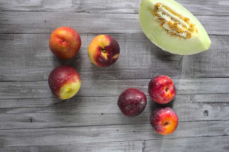 Fresh summer fruits, melon slice, some red plums and nectarines on wooden table.