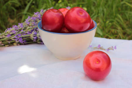 Fresh purple cherry plums in a bowl and lavender flowers on the table in the summer garden.