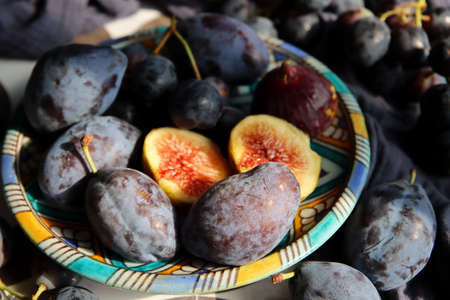Colorful still life with fruits. Plums grapes and figs close up photo. Healthy eating concept. Fresh seasonal fruits top view. Textured fabric background.