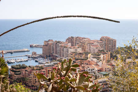 Monaco cityscape panoramic view from the hill over cactuses