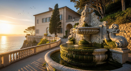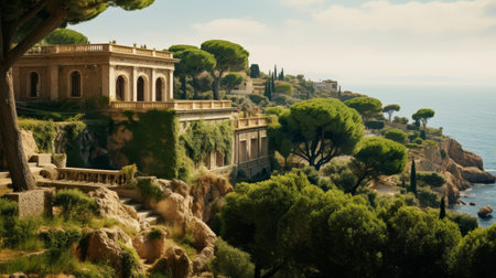 Roman villa perched on cliff with terraced gardens and statues