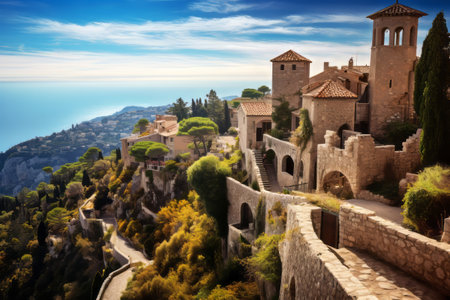 Enchanting Vistas: A Glimpse of the Mediterranean Coastline, Medieval Houses, and Exotic Gardens from atop Eze Village on the French Riviera