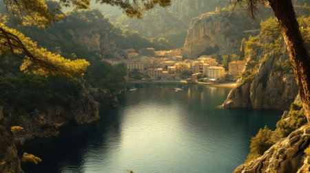 A serene bay surrounded by majestic cliffs showcases a picturesque village bathed in the warm glow of sunset. Calm waters reflect the colorful buildings, creating a tranquil atmosphere.