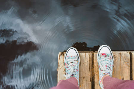 Women's feet stand on a wooden pier. A girl in sneakers is resting on the lake.