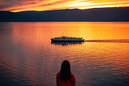 Girl looks at the sunset on the lake Baikal of a cruise boat. Asia. summer