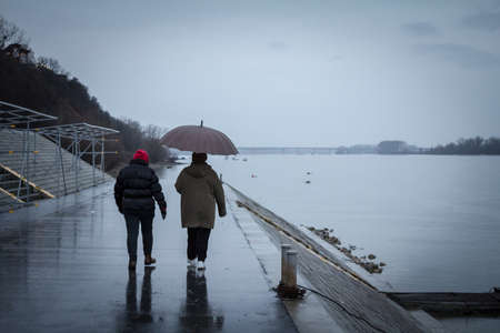 BELGRADE, SERBIA - JANUARY 31, 2016: People, couple, walking with umbrellas near the Danube river on Dunavski kej during a rainy winter afternoon in Zemun, a northern district of Belgrade.