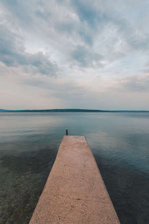 Concrete dock at seaside in sunrise, island of Krk and Adriatic sea in background
