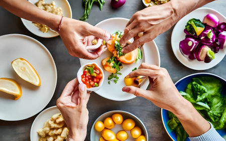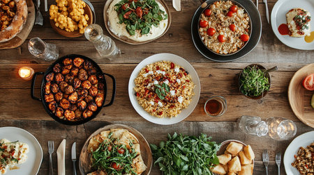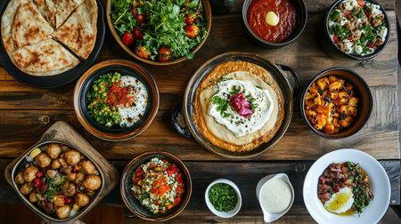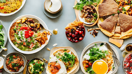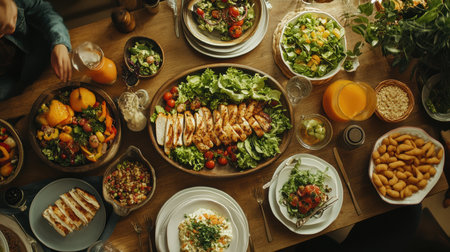 A top-down perspective captures a lively gathering around a table laden with diverse and colorful dishes, showcasing a shared meal experience.