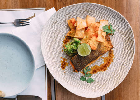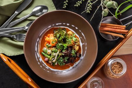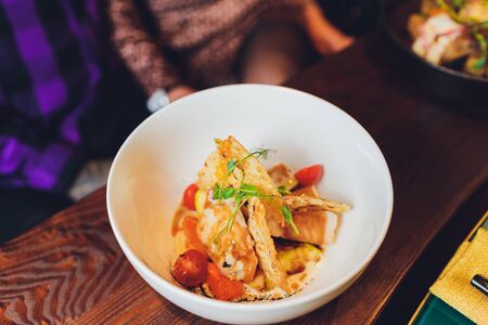 European international fusion cuisine, a beautiful dish on a white plate decorated with herbs and vegetables. a professional chef has prepared a delicious meal. Vegetarian food and meat restaurant dishes. fast food.