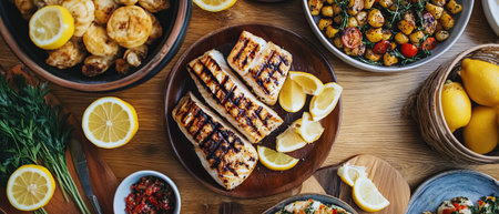 Enjoying a delicious grilled swordfish dinner with lemon wedges and fresh sides