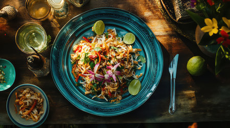 A vibrant bowl of Thai noodles garnished with fresh vegetables, lime slices, and colorful flowers, served on a rustic wooden table. Ideal for food lovers.