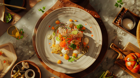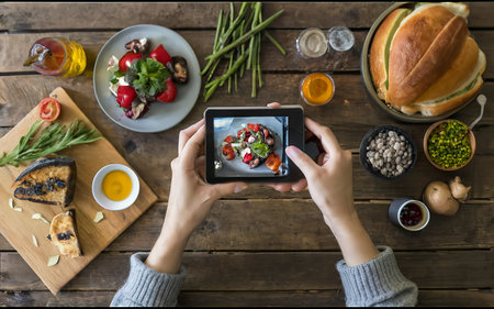 A captivating scene featuring a gourmet dish being photographed, highlighting fresh ingredients and artistic presentation on a wooden table, embodying culinary creativity.