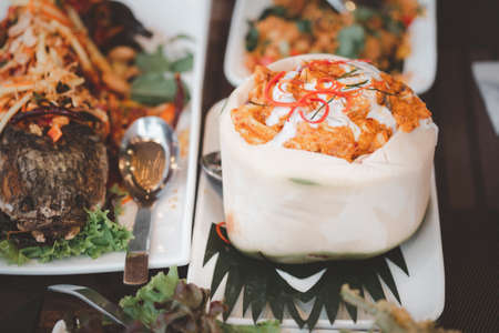 Homok seafood. Prawns, clams, crabs, fish steamed spicy Thai with curry paste. Creative food styling presenting original authentic Asian Thai food