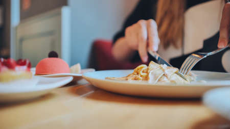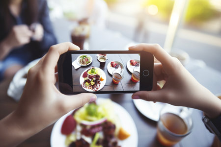 Woman taking photo of breakfast served in cafe. Couple having meal together. Generative AI.