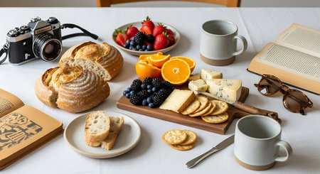 A beautifully arranged breakfast spread featuring a variety of fresh fruits, artisanal cheeses, crackers, bread, and coffee cups on a white table, accompanied by a camera, books, and sunglasses.