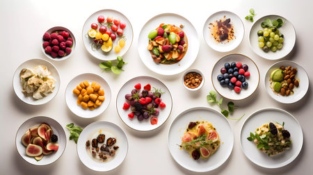 A stunning top view of a table filled with vibrant fresh fruits and gourmet delicacies, perfect for a lavish dining experience or celebration.