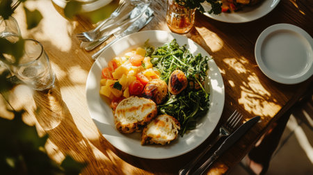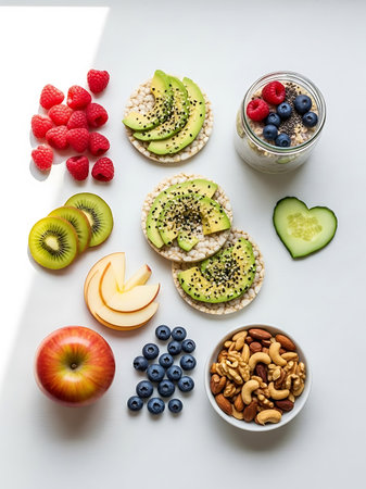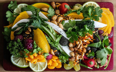 Vegan food presentation in daylight, fresh plant-based ingredients for healthy organic diet display