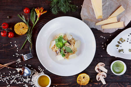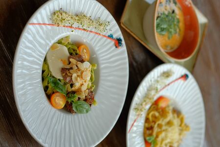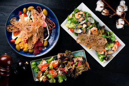 Top view of different dishes on the table in a restaurant. Restaurant menu