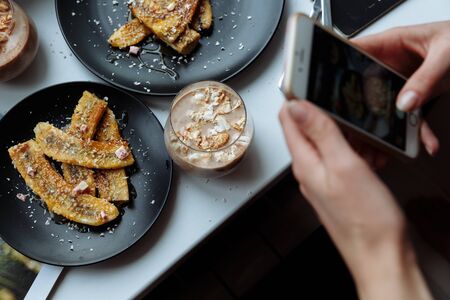 Woman taking a photo of breakfast with smartphone, hands hold phone, frome above.