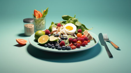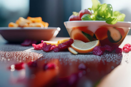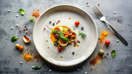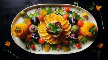 A vibrant AI-generated food presentation, with dishes composed of perfect geometric shapes and vibrant colors, blending creativity with precision.