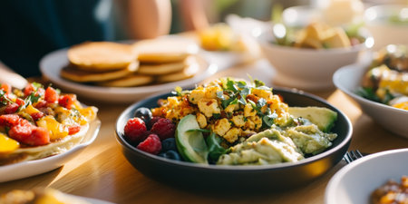 Hearty Vegan Brunch with Fresh Fruits and Avocado on a Sunlit Table.