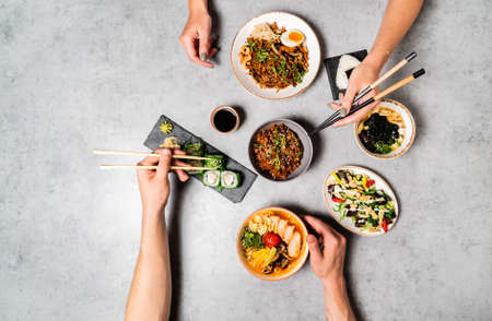 Close up of unrecognizable man taking photo of delicious Asian food, focus on smartphone screen, copy space