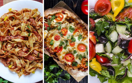 Pizza with tomatoes, tomato paste and fresh vegetable salad close-up. Vertical collage of dishes from different cuisines of the world.
