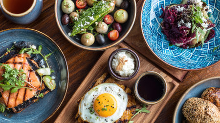 A vibrant collection of beautifully arranged dishes on a wooden table, showcasing a mix of gourmet foods, including salmon, salad, and a sunny-side-up egg, perfect for dining lovers.