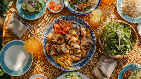 A festive outdoor picnic with plates of grilled chicken and som tam, enjoyed under the sun