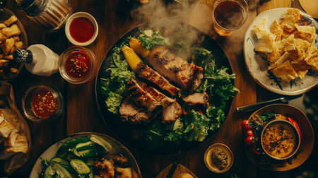 An inviting spread of grilled meats surrounded by fresh greens and condiments on a rustic wooden table, perfect for sharing and enjoying with family and friends.