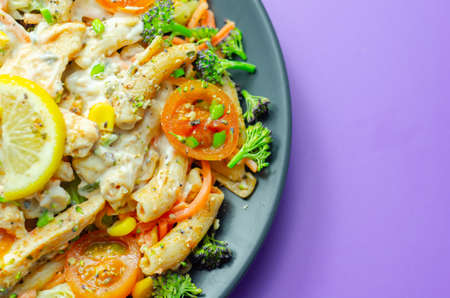 Piri piri style chicken on a bed of wholewheat pasta and vegetables, with a cool sour cream and chive dressing, tasty and healthy meal