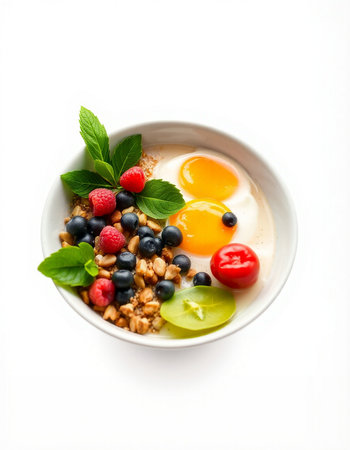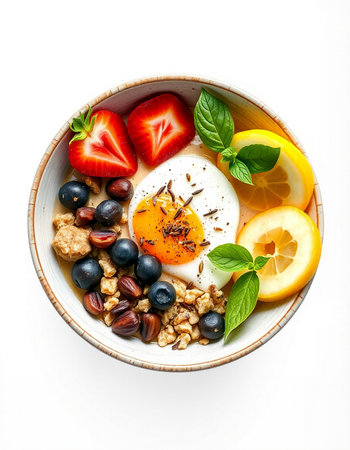 Healthy breakfast bowl with oatmeal, berries, fruits, nuts and egg isolated on white background