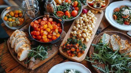 Variety of colorful cuisine served on wooden cutting boards and dishes