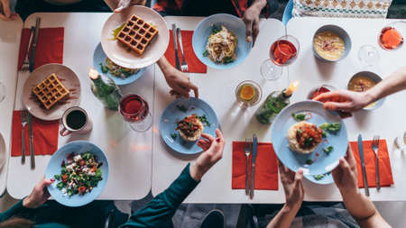 top view of the feast of people at the table covered with food and drinks with dishes, salads, fruits, vegetables, wine and sauces