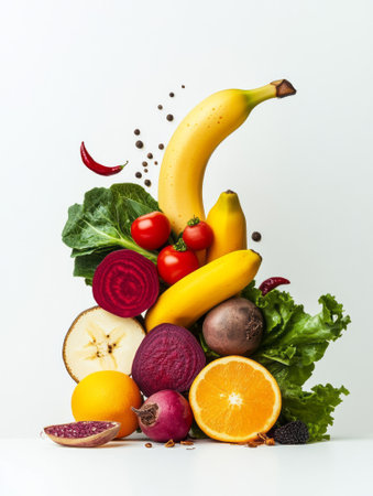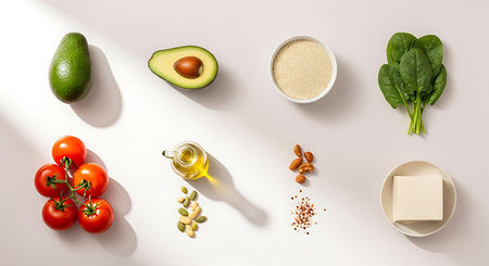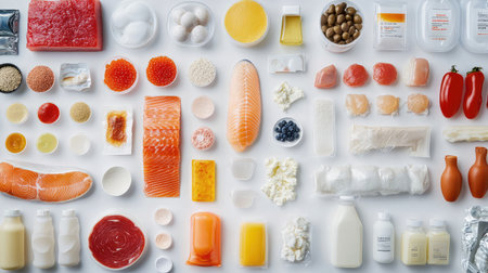A diverse composition of nutritious food items elegantly presented in a balanced arrangement.