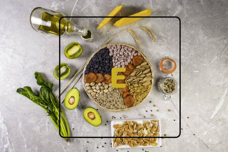 Food sources of vitamin E, high in antioxidants, anthocyanins, minerals and fiber, The concept of healthy food for brain and heart on concrete background, top view, flat lay
