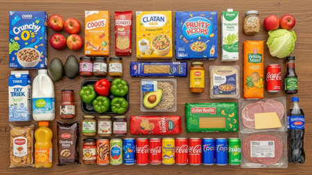 An overhead view displays a diverse collection of food products, meticulously arranged on a wood-grain surface. The composition includes packaged goods, fresh produce, and beverages. The lighting appears natural, highlighting the various colors and textures of the items. This arrangement is suitable for illustrating concepts related to groceries or meal preparation.