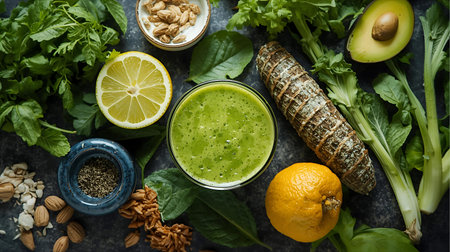 Green smoothie with spinach, lemon, avocado and nuts on a dark background Generative AI