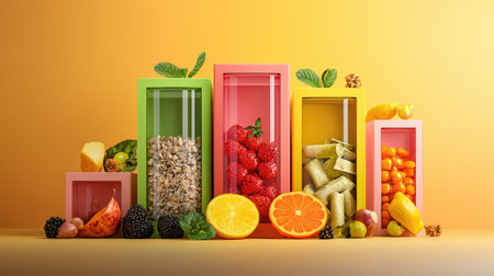 Colorful display of fresh fruits and grains in vibrant containers against a yellow background, promoting healthy eating and vibrant aesthetics.