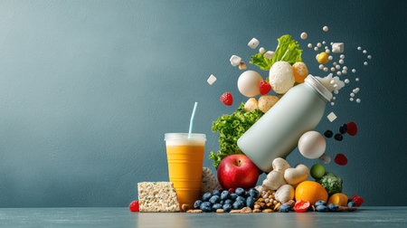 A vibrant display of fresh fruits, vegetables, and a shake, emphasizing healthy eating and nutrition.