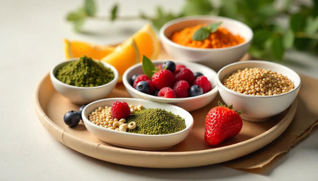 A visually appealing arrangement of dried fruits, nuts, grains, and fresh berries on a neutral background, highlighting health-conscious eating and vibrant colors.