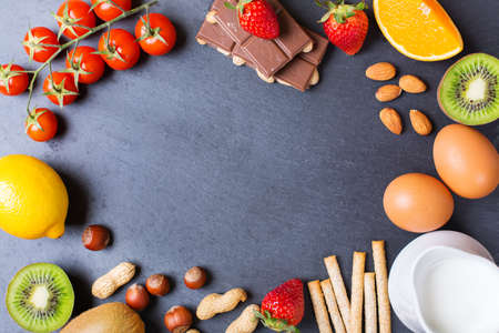 Selection of allergy food, orange lemon citrus fruit red tomato strawberry kiwi chocolate nuts eggs milk bread gluten food. Copy space board background, top view flat lay overhead