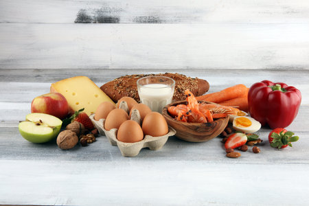 Allergy food concept. Allergy food as milk, oranges, tomatoes, garlic, shrimp, peanuts, eggs, apples and bread and strawberries on wooden table